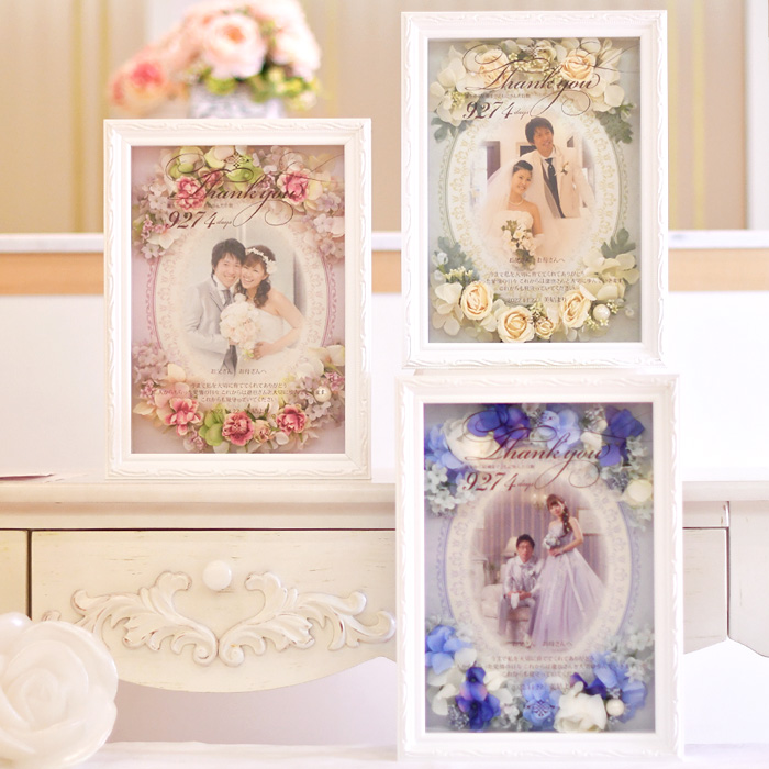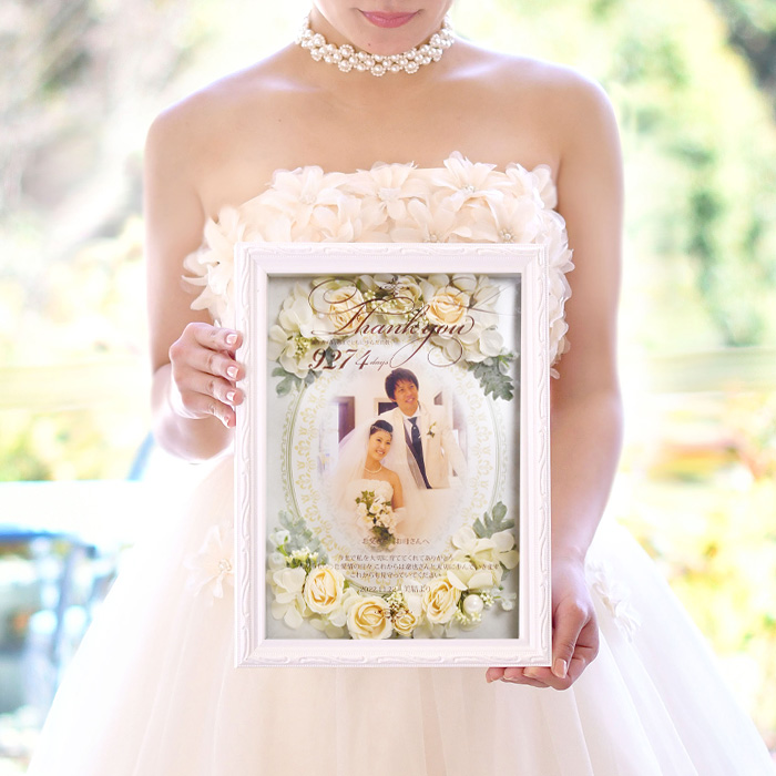 お花をたっぷりあしらった贈呈品からは、アイボリーなど淡めのコーディネートはいかがでしょうか。可憐で繊細な花嫁を彩ってくれます。可憐で上品なレイアウトは式後飾っていただくお部屋も華やかに。