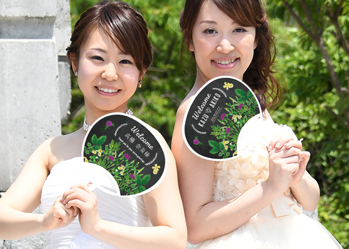今の季節にゲストが驚く演出でオススメなのが席札をうちわで作ってしまったこちらのアイテム。デザインがシックなので式の雰囲気にも合わせることが可能です。