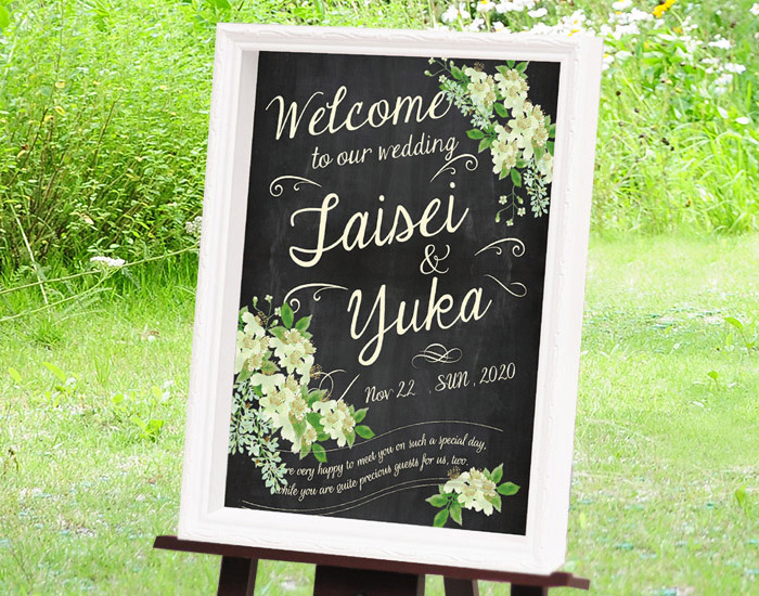 お花たっぷりもいいけど、こちらのアイテムはおしゃれなブラックボード風ウェルカムボード。ブラックとオフホワイトのフォント&デザインが大人スイートなボタニカルを演出。お二人のお名前と挙式日が入ります。フレーム付きなのでお急ぎの方にもオススメ。