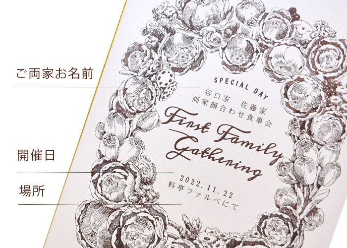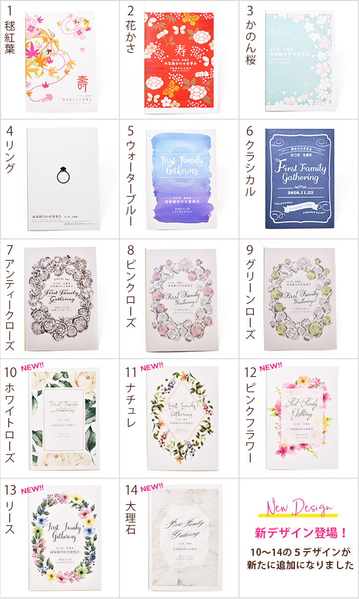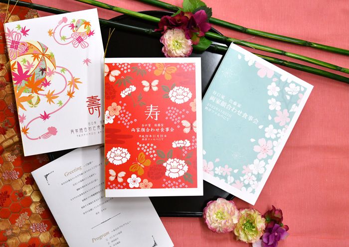 料亭での顔合わせ会なら和風デザイン、ホテルならシンプルに、レストランならイマドキおしゃれデザインなど会場の雰囲気にあわせて選ぶこともできます。