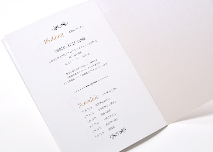 さらに、表紙にはご両家のお名前・開催日・場所を名入れ印刷した状態で届くから、表紙に関してはそのまま使えるといううれしいセット。セミオーダー的なオリジナル表紙で、完成度の高いしおりが作れます。