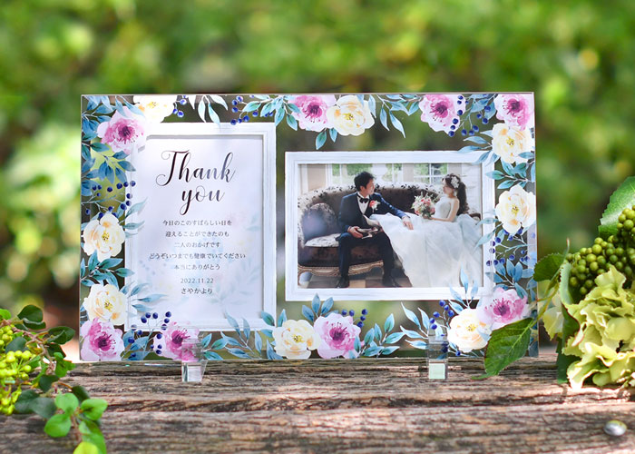 こちらはガラスフォトフレームの子育て感謝状。自分で写真をセットできるから、前撮りの写真を使いたいけど間に合わないかも…などの心配もナシ!商品が届いてからゆっくり好きな写真を選んで贈ることができます。