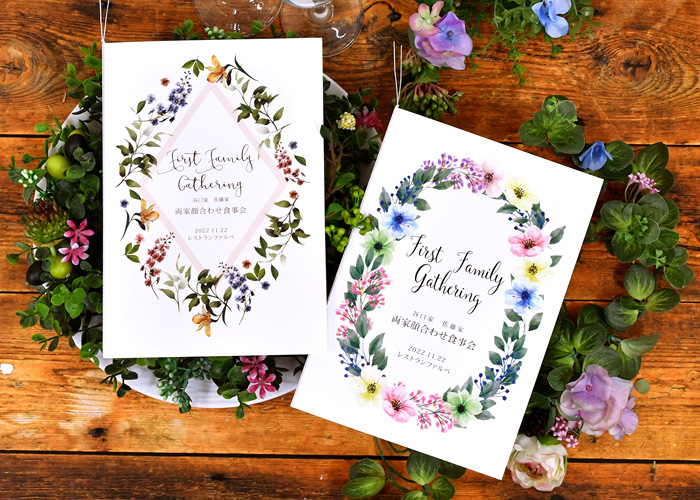 準備物としてよく聞くのが「顔合わせ会しおり」。食事会を予定されている方が、参加される人数分用意する、結婚式でいうメニュー表やプロフィール表のようなものをまとめたペーパーアイテムです。