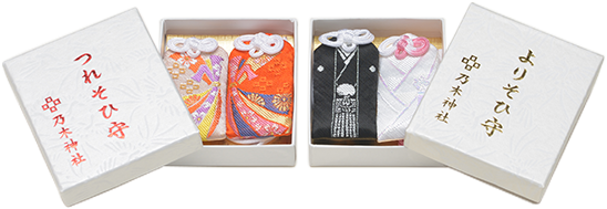 新郎の紋服、新婦の白無垢をあしらい、夫婦となる2人が末永くよりそって頂くようにと願いを込めた御守です。