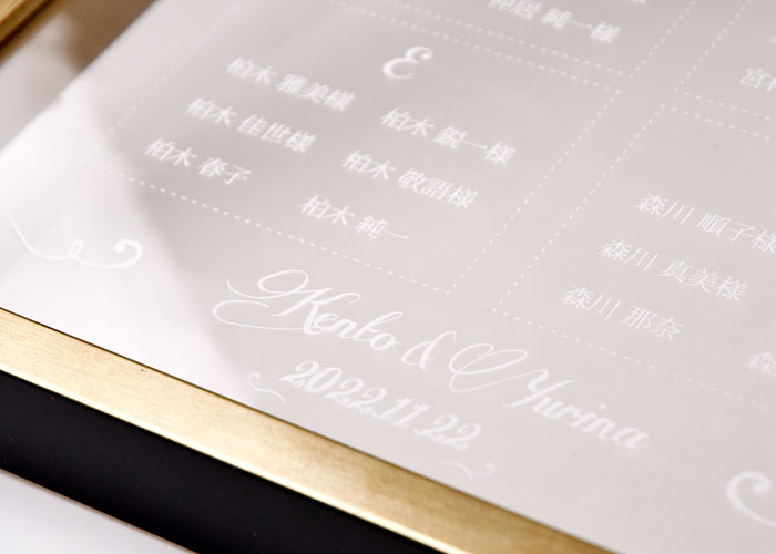 透明に映える白文字がイマドキで可愛い♡文字部分は透明フィルムに白印刷されていて取り外し可能になっているので、式後はフレームだけで使えて新居のおしゃれなインテリアにもなります。