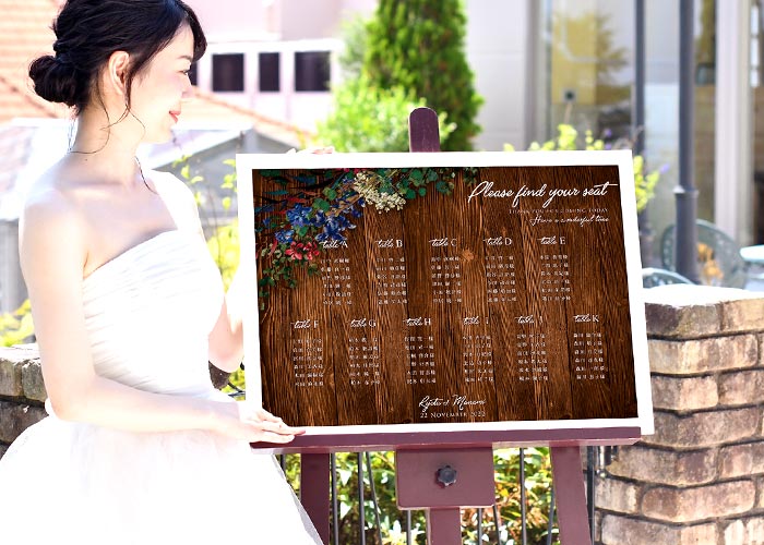 肩書も入れたいし、テーブルのどの位置かまでご案内したいなら席次ボードタイプ。シンプルにテーブル名だけ分かってもらえればいいという場合はシーティングチャートタイプと、両方用意されています。