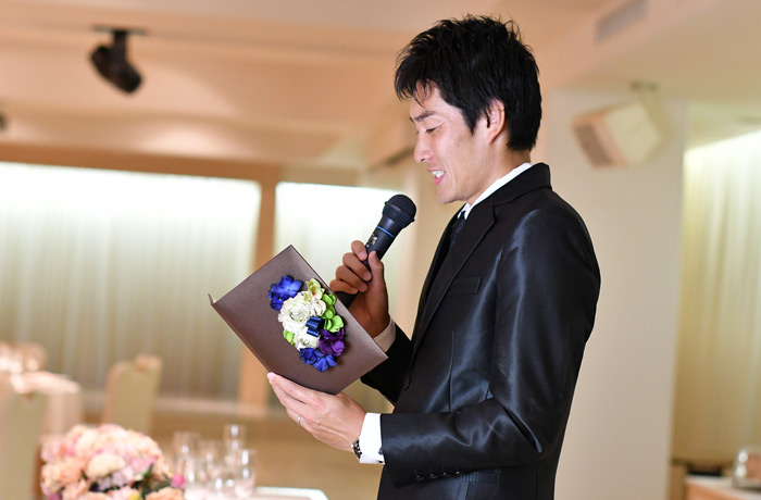 司会者さんに一言「新郎さんからは手紙も添えられています」とアナウンスしていただけるとゲストもその粋な計らいを知ることができます。もちろんサプライズ演出として新郎さんが読み上げても。ただ朗読シーンは二人が行うと、時間をたっぷり使うのでゲストも疲れがち。プランナーさんと相談して全体の中で調整するようにしましょう。
