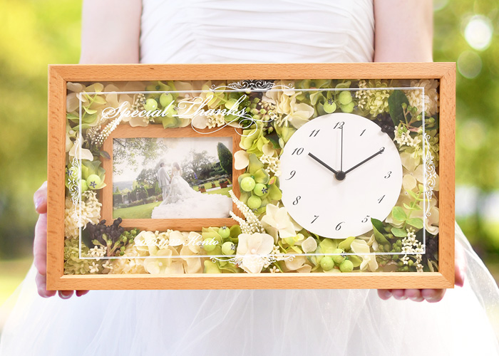 毎日目にする時計にお二人の幸せそうな写真が添えられる、フラワーフォトフレームもおすすめ。新郎新婦様お揃いで贈って、ご両家の絆を深めたり、お二人の新居にも用意すれば家族の繋がりをいつまでも感じることができる心温まる贈り物です。