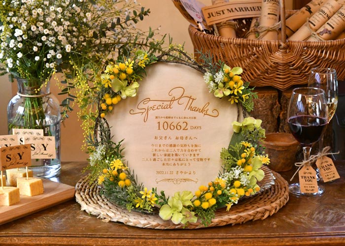 イメージは膨らんできたけどやっぱり手作りは自信がないな…という方におすすめ!せっかく買うなら、こんなおしゃれな子育て感謝状はいかがでしょうか?アーティフィシャルフラワーがいっぱいにあしらわれたレーザー彫刻タイプの感謝状。お二人のお名前や記念日数、メッセージがしっかり刻まれていて、このクオリティ、ちょっとお家では作れないかも!