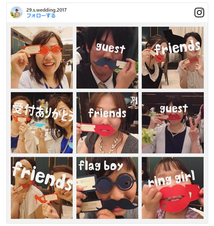 もともと一人にひとつずつ用意する席札をフォトプロップスにするのは効率的かつおしゃれなアイデア!写真撮影も盛り上がってゲストのおもてなしになること間違いなしです。