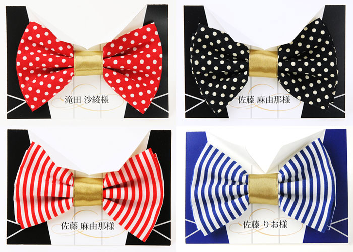 この蝶ネクタイ部分はとりはずしてハンカチとして使えるようになっています。ハンカチのデザインは4種類から選べます。