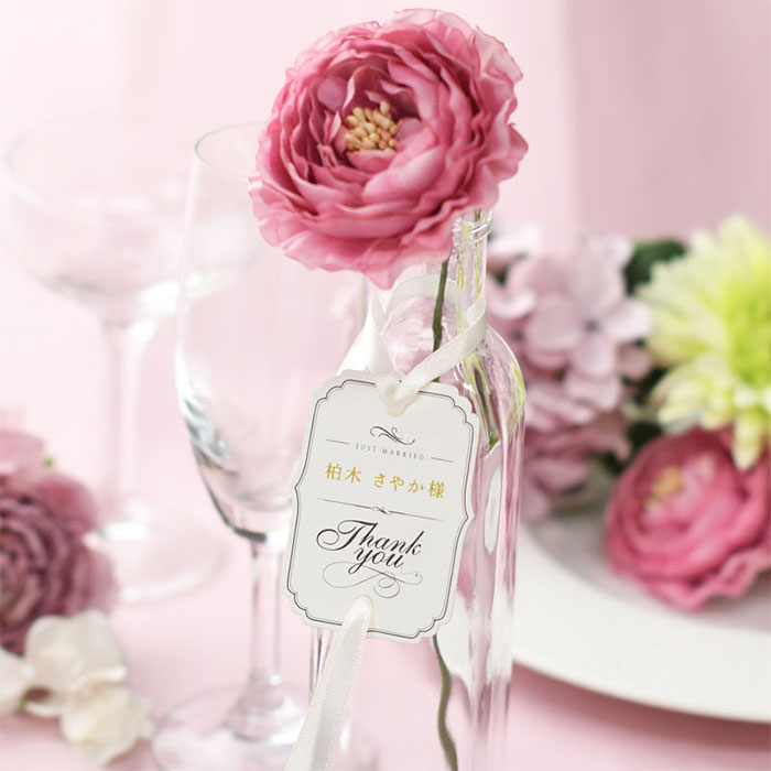 こちらはボトル用タグ。瓶などの首にかけられるようリボンがついています。100均でも手に入るボトルに挿してもおしゃれ♡装花をテーブルのセンターにではなく、ゲスト一人一人のお席に席札として置くのも素敵ですよね♡