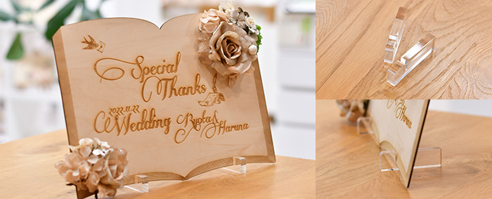 花嫁の手紙を贈呈品として贈るなら絶対用意したいアクリルスタンド。アレンジのお花と「Special Thanks」の文字が式後のお部屋で感謝の気持ちを伝えます。