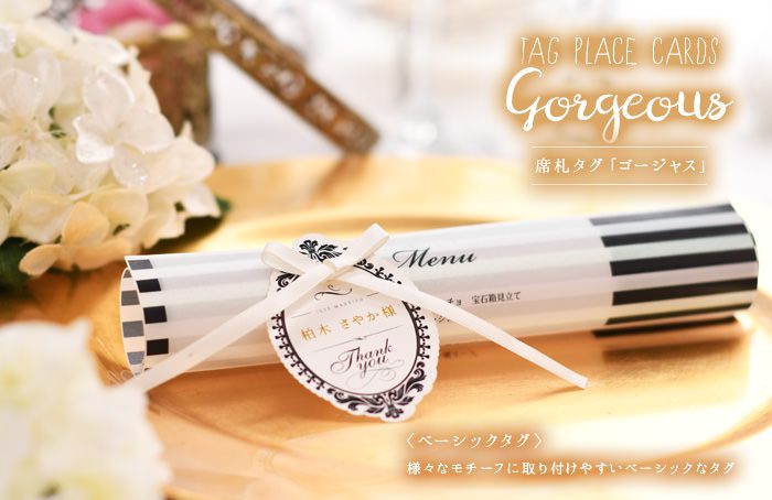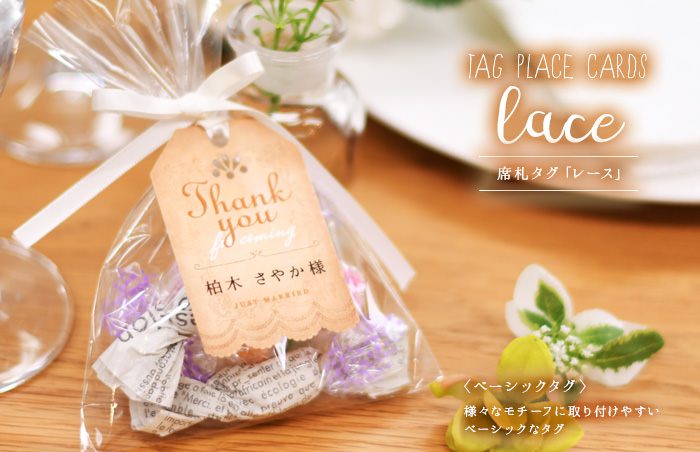 席札にもなるテーブルアイテムの席札タグ・ボトルタイプを選択すれば、リボンを通す穴があって装着が簡単。テーブルの雰囲気をプラスするチャンスです。