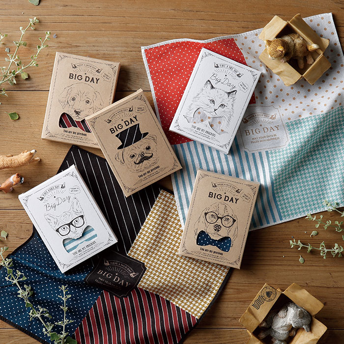 ミニマルおしゃれ婚も豪華な結婚式も、アニマルモチーフなら間違いなし!こちらのハンカチプチギフトは、おしゃれなファッションの犬や猫の、ネクタイやハットシルエットからハンカチが見え隠れします。