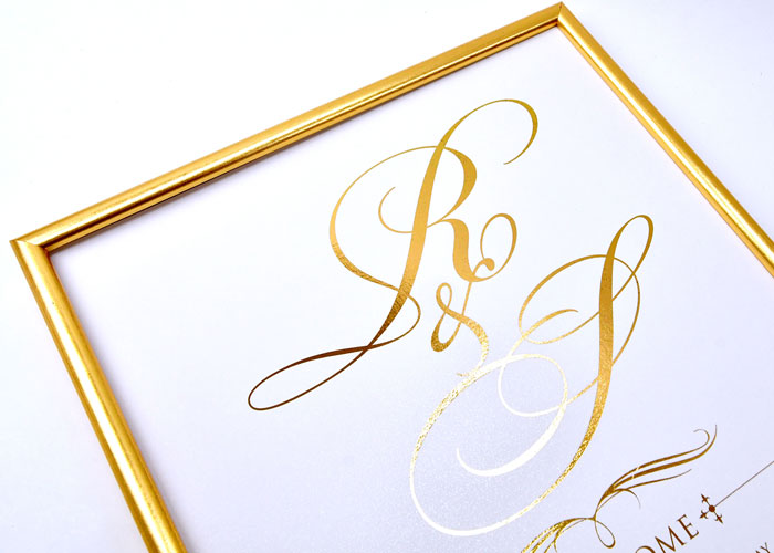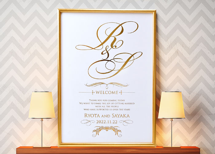 インパクトで選ぶなら、もっとサイズの大きなウェルカムボードのデザインにがっつり取り入れてみても。フレームにゴールドのラインが繊細なアレンジは、シックかつゴージャス。オールシーズン使えるイニシャルモチーフなら、式後も新居に飾りやすいおしゃれなアイキャッチに。