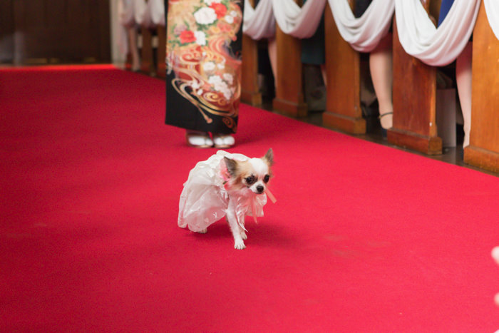 個性的な演出をたくさん取り入れられたお二人。リングボーイならぬリングドッグの登場で会場はほんわか♡ワンちゃんも一生懸命歩いてきてくれたそうです♡
