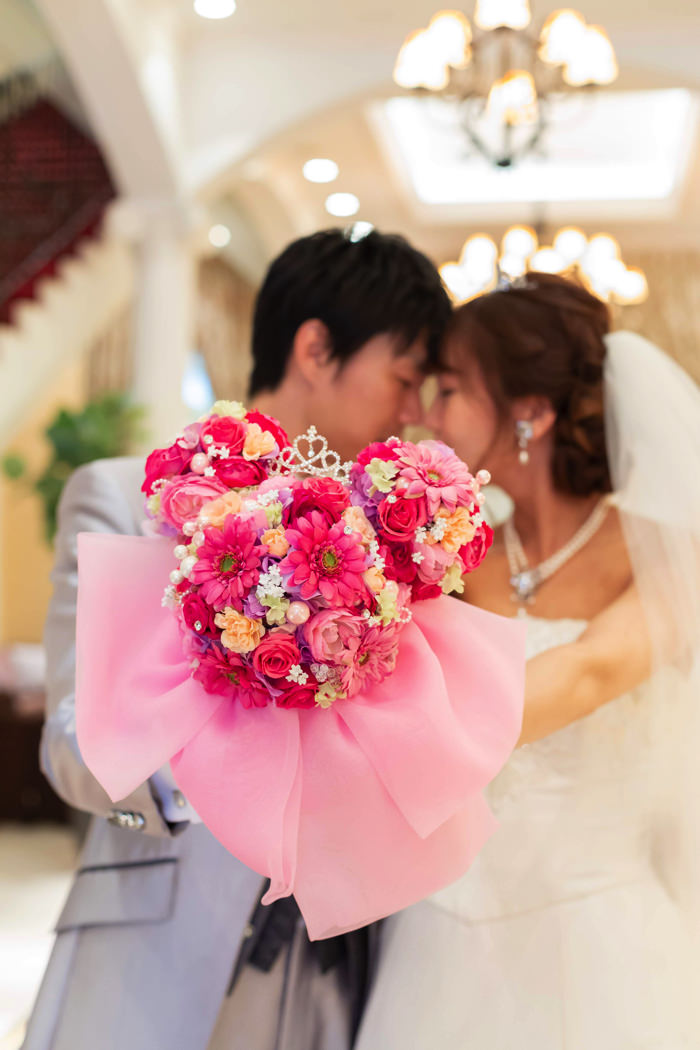 ミニブーケは大好きなミッキーの形でオーダーされました。綺麗なフォルムの仕上がりに、大満足なお二人♡大きなリボンとちょこんと乗ったティアラがとってもキュートですね♡
