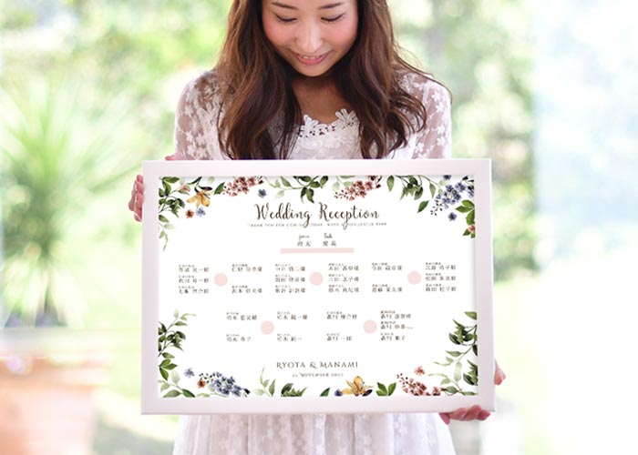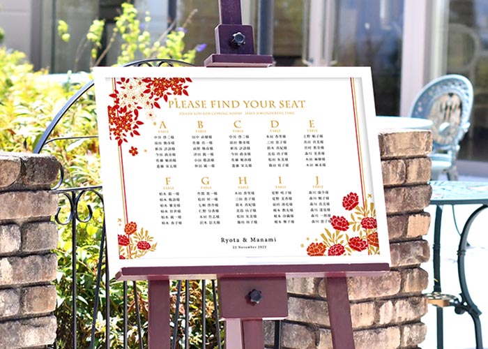 レストランにも専門会場にも(屋外の式場でも!)合わせやすいとってもおしゃれなデザイン。レイアウトを同じデザインで席次ボードとシーティングチャートから選べるほか、30名までサイズ・60名までサイズ・100名までサイズから選べるのも嬉しい♡デザインを変えて、それぞれの式場で用意したいアイテムです。