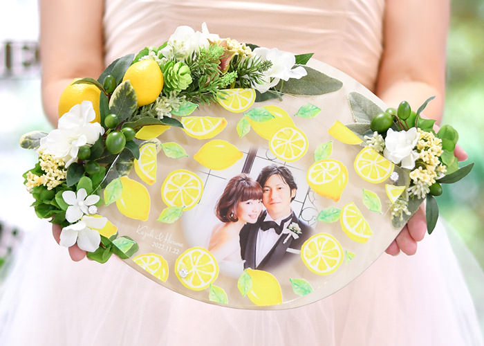 こんなピリッと個性派なレモンデザインならお部屋の雰囲気もグッと明るくしてくれそう。レーザー彫刻×お写真入りというなんともリッチなデザインです。
