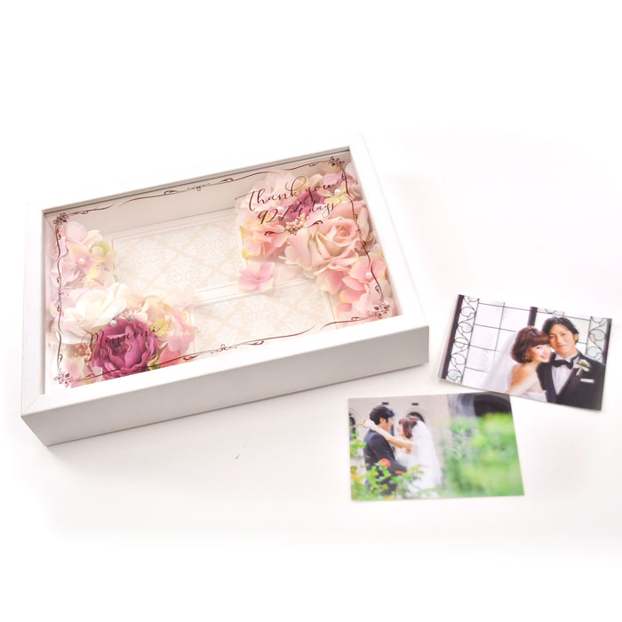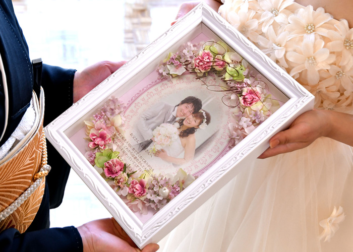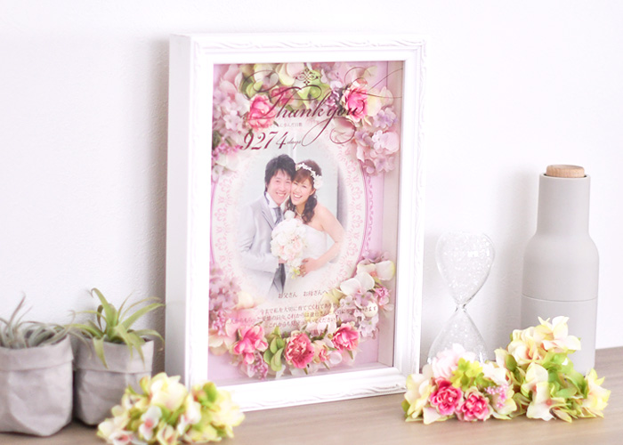 例えば感謝ボード1つにしても、本物そっくりな立体のお花を奥からアレンジしたフレームはその厚みとお花の重なりにドラマチックな演出を感じられるように。