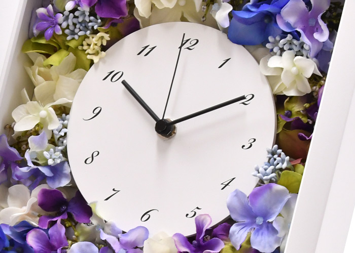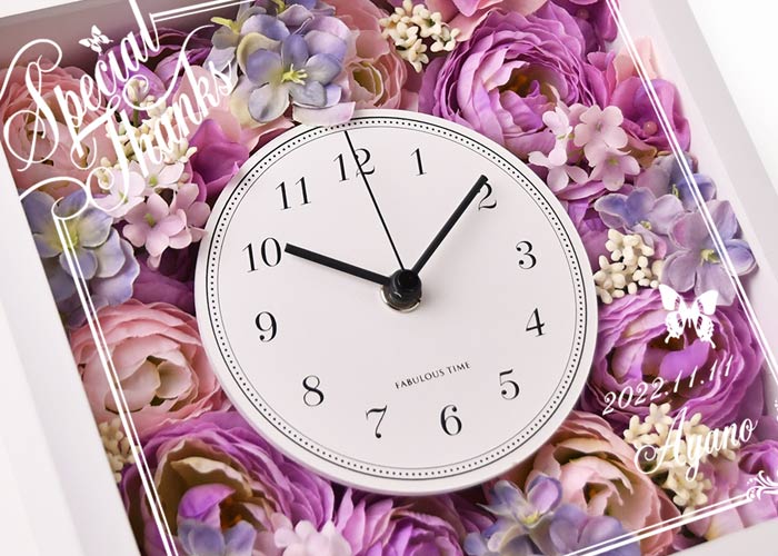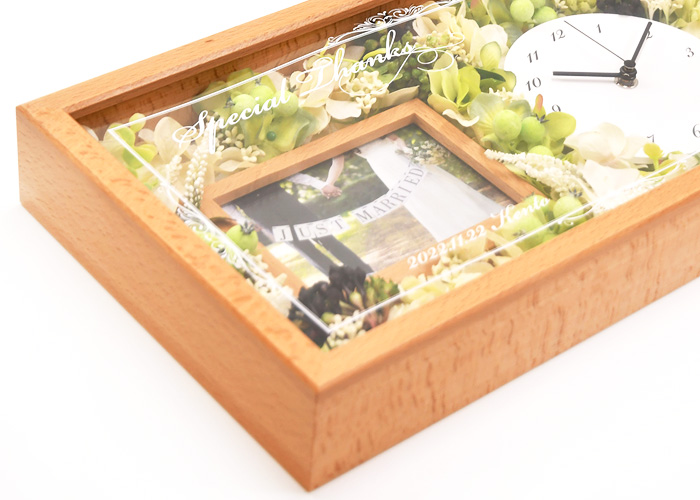 写真のセットできるアイテムには時計がセットになっているものも。優しい色合いのフラワーアレンジと、お二人の記念日を切り取ったフォトフレーム、静かに時を刻み続ける時計が、式後も静かに幸せな時を重ねてくれます。