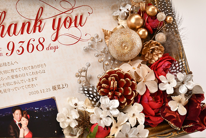 特別なお写真と、これまで歩んできた日付・ご両親へのオリジナルメッセージを入れた子育て感謝状。お花のアレンジがされているので花束代わりにもできちゃう季節にぴったりなアレンジです。このノエル・クリスマス感謝ボードは、お花のデザインが6種類から選べるのでゴージャス・キュート・小ぶりなどいろいろ選べるのが嬉しいですね♪