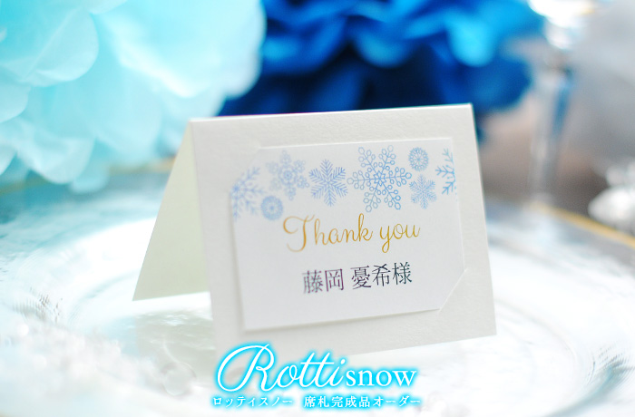 テーブルコーデには雪のモチーフを添えて。席次表やテーブル装花のグッズとカラーを揃えることで、クリスタルのように透明感のある透き通ったイメージが完成します。