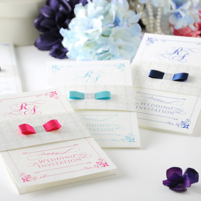 リボンはホワイト、マゼンダ、ネイビーの3色。新郎新婦のゲストで分けてもいいですね。3色を組み合わせて使うのもおすすめ。本状は縦型で、台紙の内側に耳を設けてゴムひもなしで閉じています。
