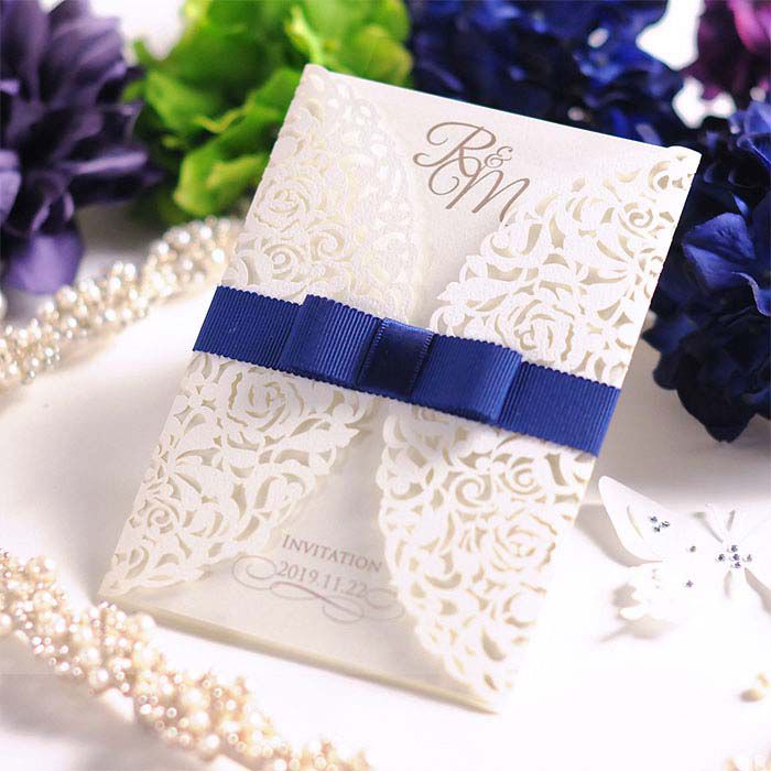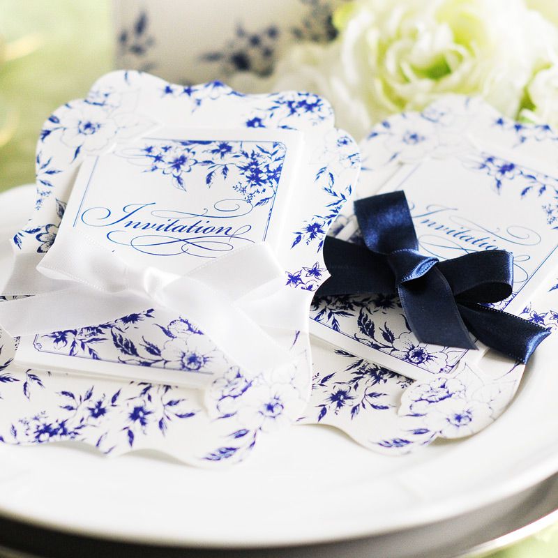 上品なネイビー使いは大人女子の特権! パール感のある台紙をバラ柄のレースで包み、ネイビーのリボンでとめた招待状「クレア」。まるで花嫁様のドレスのようにラグジュアリーです。