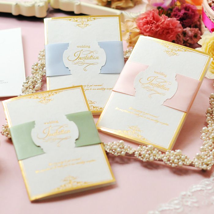 3色展開でドレスの色や挙式スタイルに合わせてコーディネートするのもおしゃれ。封を開けた瞬間、素敵なウエディングのイメージが膨らむ招待状です。