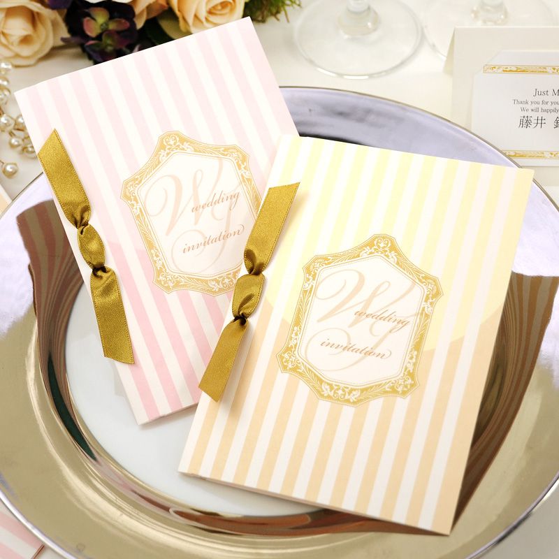 まるでお菓子の箱のようなスイーツな配色と太目のストライプと、ゴールドのサテンリボンが目を引く招待状。中からマカロンが出てきそうな予感がしませんか。