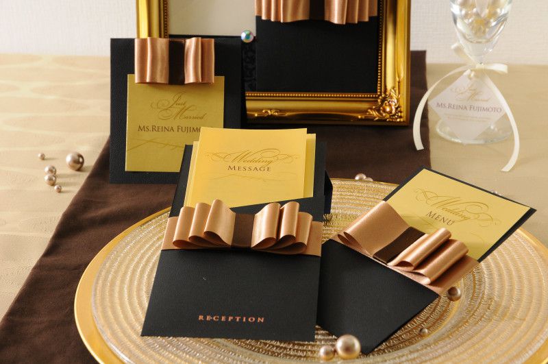 優しいニュアンスカラーの太目リボンを大胆に使い、質感のあるホワイトの紙に、マットゴールドの文字がとっても上品。ラグジュアリー感あるロマンチック&スイートスタイルです。
