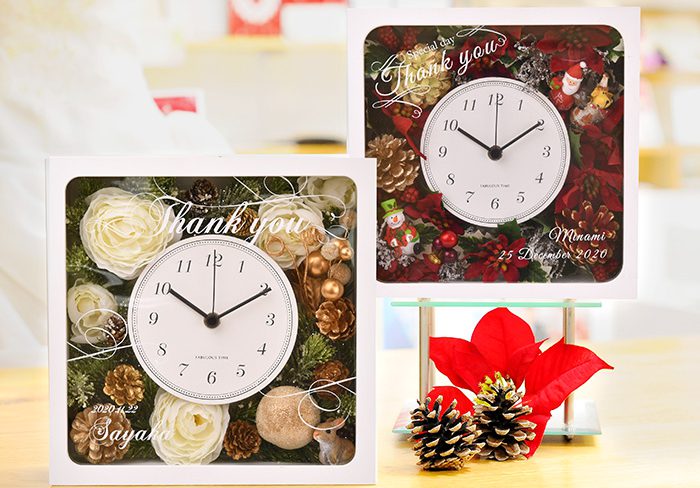 シーズンだけなんて!ずっと飾って欲しいから実用性も欲しい!という方にはこちらの花時計がおすすめ。キュートでシャイニーなアレンジがお部屋を明るくイメージアップしてくれます。デザインは5種類。お部屋に合わせて選べるのも嬉しいですね♪