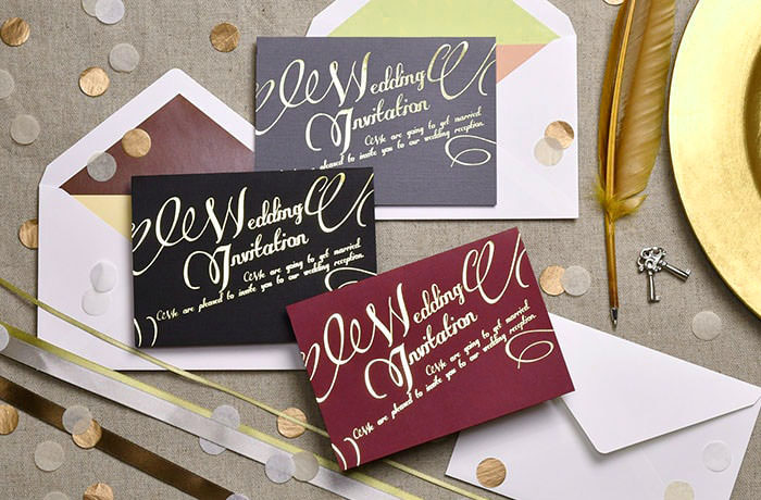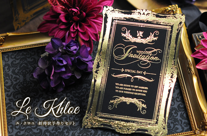 今では結婚式でも人気のブラックアイテムも。漆黒の台紙もゴールドとの組み合わせで、金糸の刺繍を施されたシルクのように輝きだします。