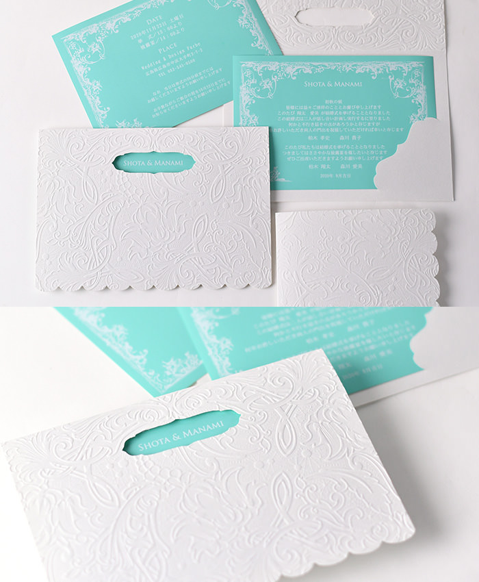 こちらは台紙ではなく中紙がカラーシートにホワイトテキストの珍しいアイテム。繊細なフレームモチーフと、アンティークなエンボス加工が美しいホワイトの台紙がおしゃれなのにキュート。上品さの漂う招待状です。