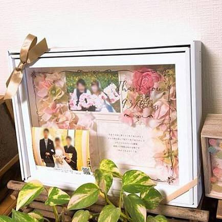 お届け後好きな写真をセットできるフォトフレームは、写真が入るフレーム部分にオリジナルメッセージをプラス♡最終的に写真2枚をセットするとしても「ちょっとプラスしたい!」という新郎新婦さんの細かな心配りがうかがえる、細部に光るアレンジです。別でメッセージカードを添えるよりも特別感が出るので真似したいアレンジですね。