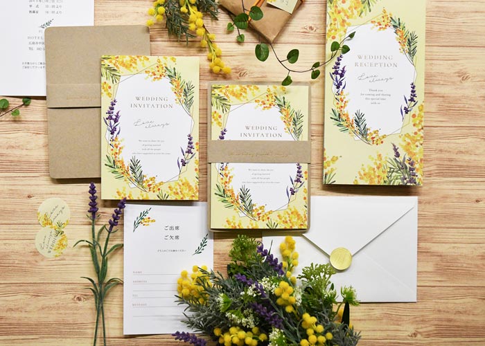 例えばミモザが可愛い招待状「ルフレ」。デザインが気に入ったら同じデザインの席次表と席札も一緒にオーダー完了。「まだ席次表の席順きまってないよ?」という方も、手作りタイプなら自分のペースで作れちゃいます。