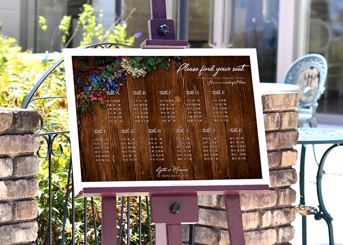席札メニュー表と併せて検討したい席次表に変わるウェルカムボード<シーティングチャート>にも人数に合わせた色々なレイアウトが。とてもラクしたなんて思われもしない、海外風挙式のようなおしゃれな雰囲気に!
