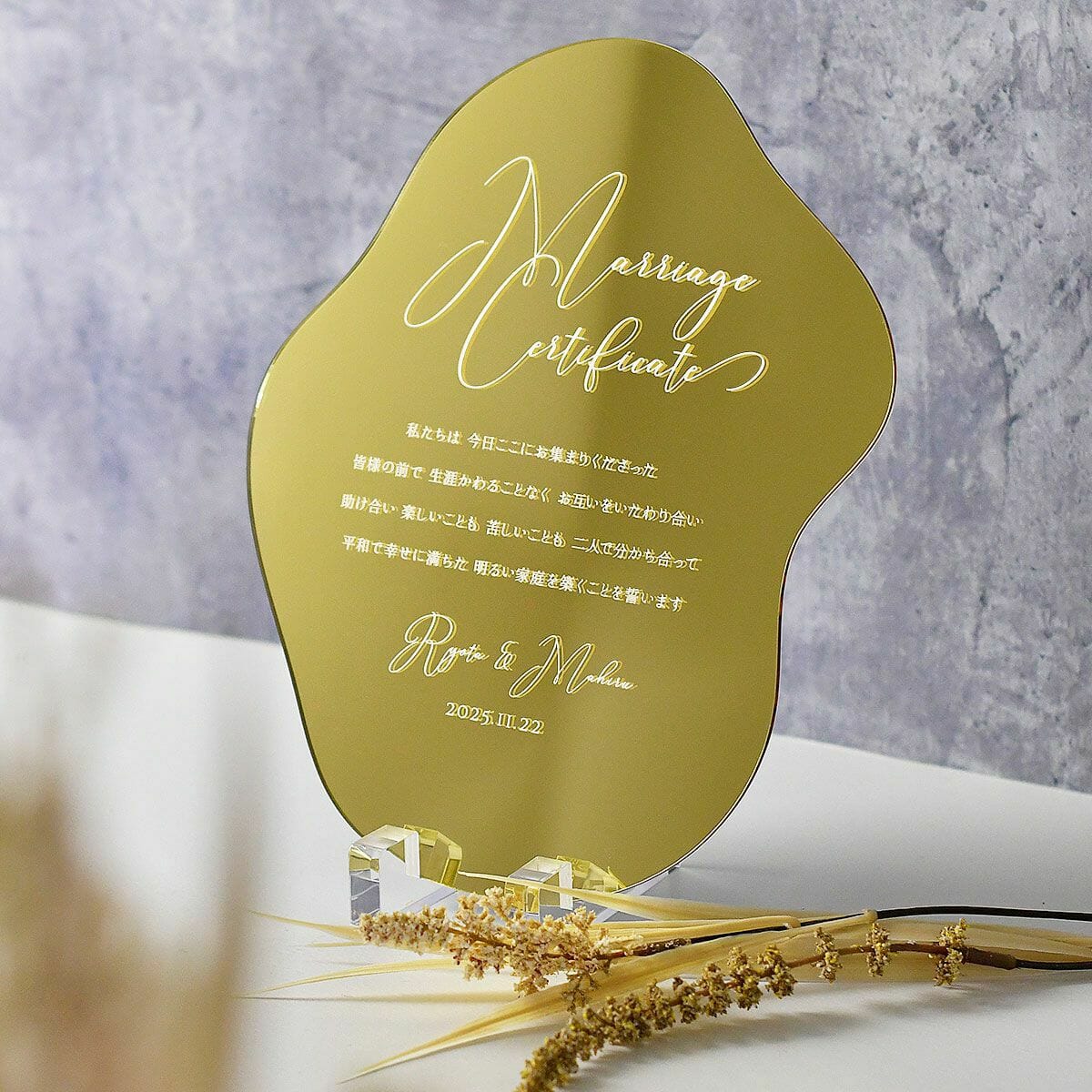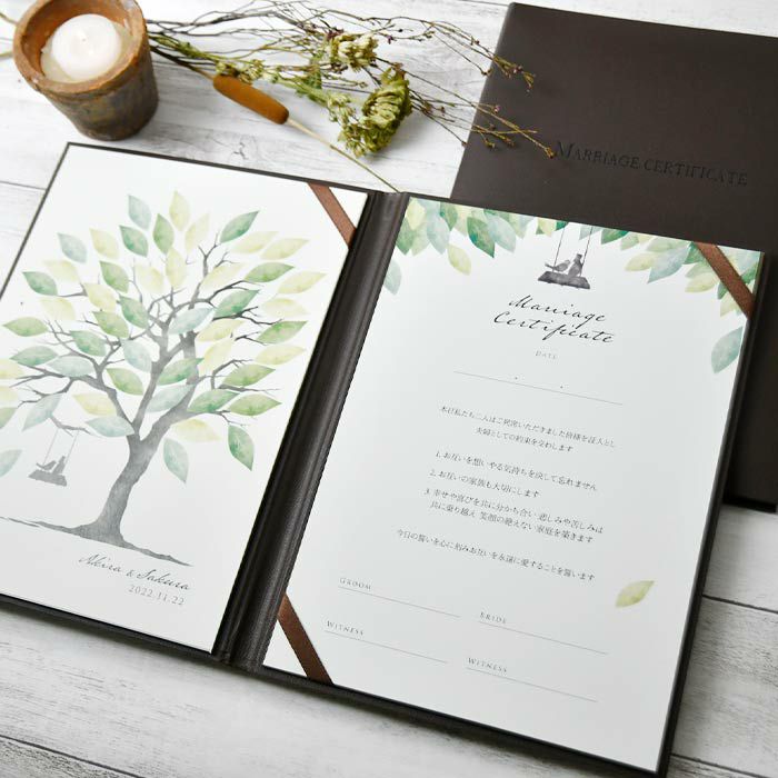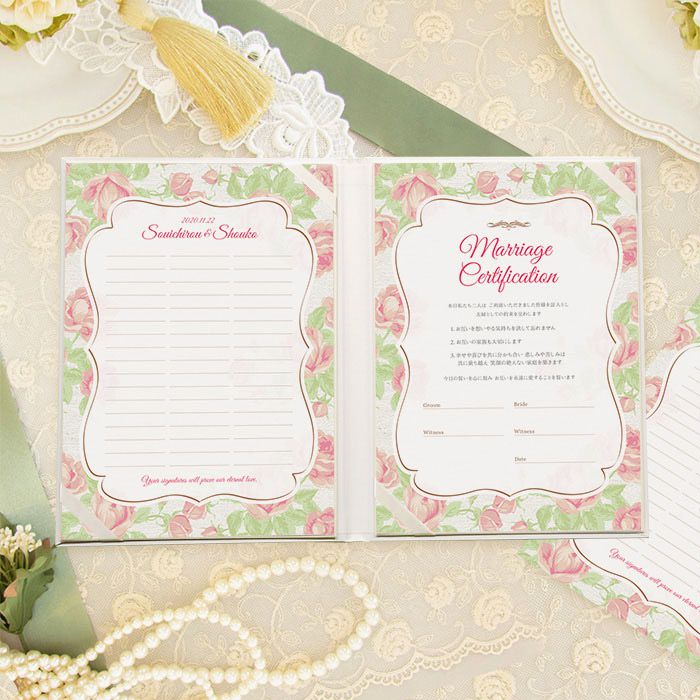 結婚証明書とは、新郎新婦が夫婦になる誓いをサインする誓約書。婚姻届けのように法的なものではありませんが、結婚の記念として、また演出としても大事なアイテムですよね。