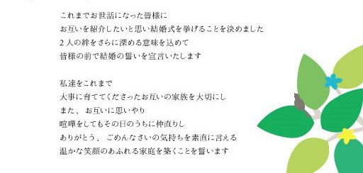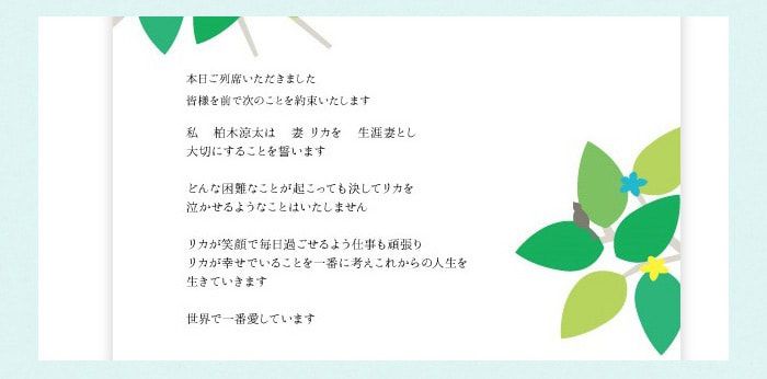 和訳:私たち二人は ここにご列席いただきました皆様を証人とし夫婦としての約束を交わします。これからはお互いに尊敬し、愛し合い助け合って平和で幸せに満ちた家庭を築くことを誓います