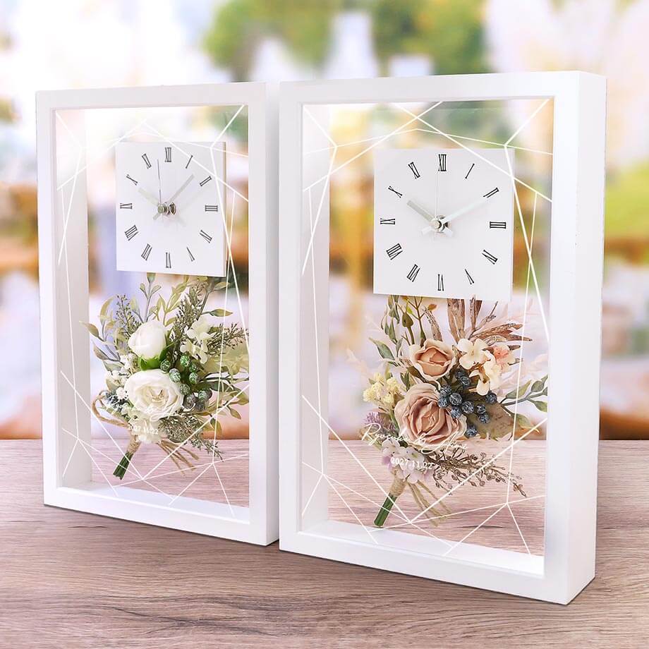 背面までクリアな時計にブーケをINした華やかでオシャレな時計ギフト。名入れもメモリアルワードである挙式日と二人のお名前をローマ字でさりげなくお入れして、特別感も添えています。インテリアとして飾ることを考えてさりげなくおしゃれに名入れしてあるのも高ポイント。