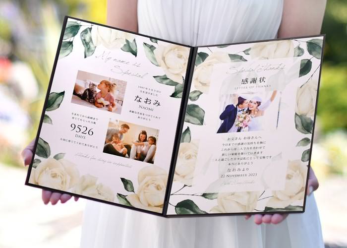 そんな作戦を打てるのがこちらの花嫁の手紙木製レーザー彫刻シリーズ。片面には両親への感謝の気持ちを綴り、片面にはたっぷりのアーティフィシャルフラワーがあしらわれた、まさに結婚式の日に読むための華やかなアレンジなんです。生花と違って式後長ーく飾ってもらえるから、読めるのにフラワーアレンジメントギフトとして大人気。