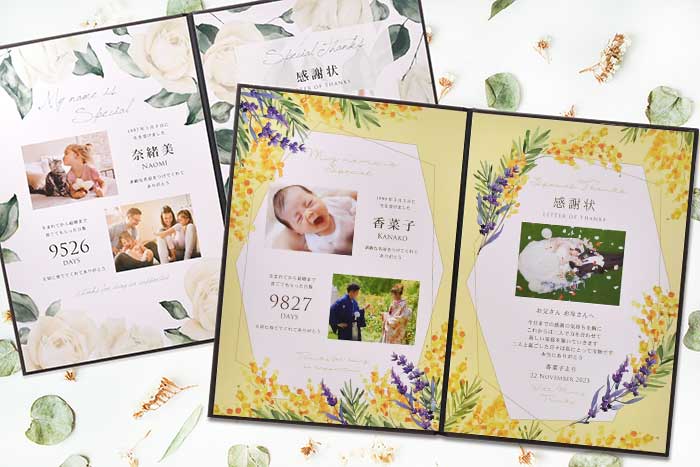 いっそインテリア性(飾るか飾らないか)はそんなに求めてない、という方にはこちらもおすすめ。お写真を3つ選んで、感謝の気持ちと一緒に過ごした日数が綴られます。美しく製本された子育て感謝状は、まさに手元にずっと残したい記念品にぴったり!