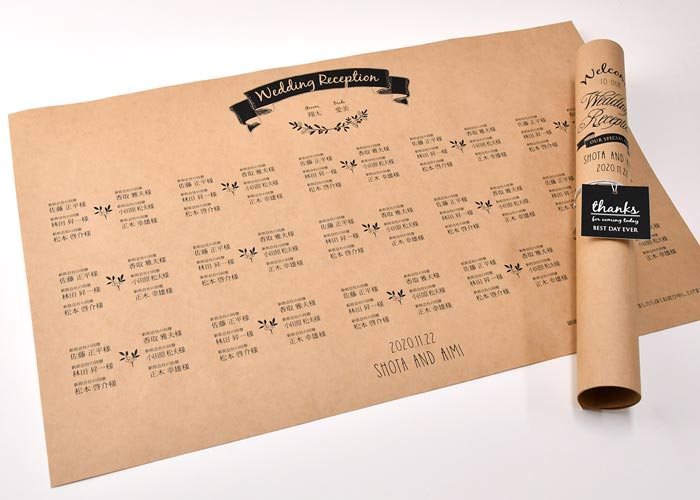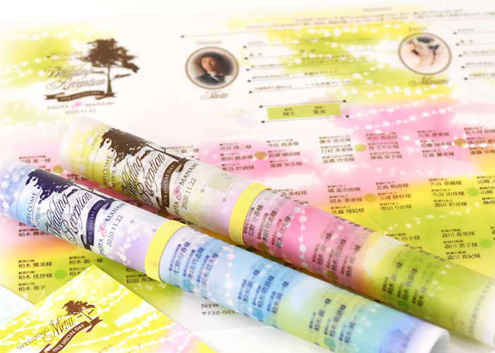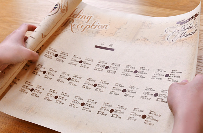 受付でもらった時からテンションが上がるのが、くるくる巻かれた席次表シリーズ。渡されて「わ!丸まってる!」とまず驚いてもらい、さらに開きながらゲストさんのワクワクが高まります。