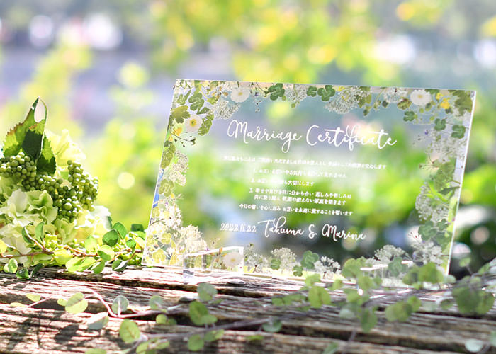 こちらのガラスの結婚証明書は、記帳ではなく読み上げるタイプ。光をいっぱいに通して式後飾るのが楽しみになる透明感たっぷりのアイテムです。