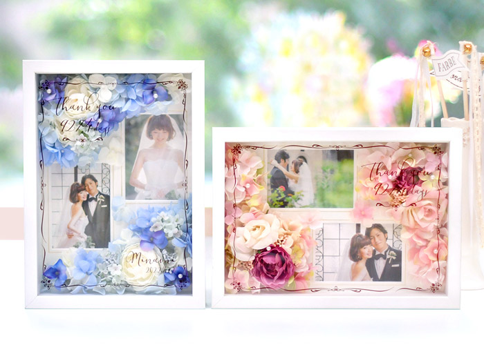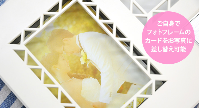 幸せな瞬間をわかりやすく留めてくれるフォトアイテム。フレームだけじゃ勿体無い。商品お届け後に写真を貼るタイプなら、とびきりの一枚を選んで当日を迎えて。