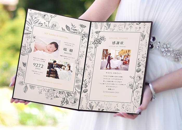 こちらは、上品なゴールドの箔押しをほどこしたクリアカバーを外側に重ねる贅沢仕様の席次表。タッセルの付いた綴じ紐が上品な雰囲気をさらに格上げしています。