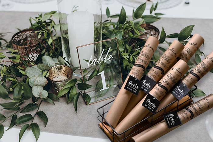 話題のくるくるタイプの席次表をクラフト紙を使ってアレンジ。用紙の風合いを生かしたデザインが人気です。かごにバサっと入れただけでも見栄えがするのも魅力。