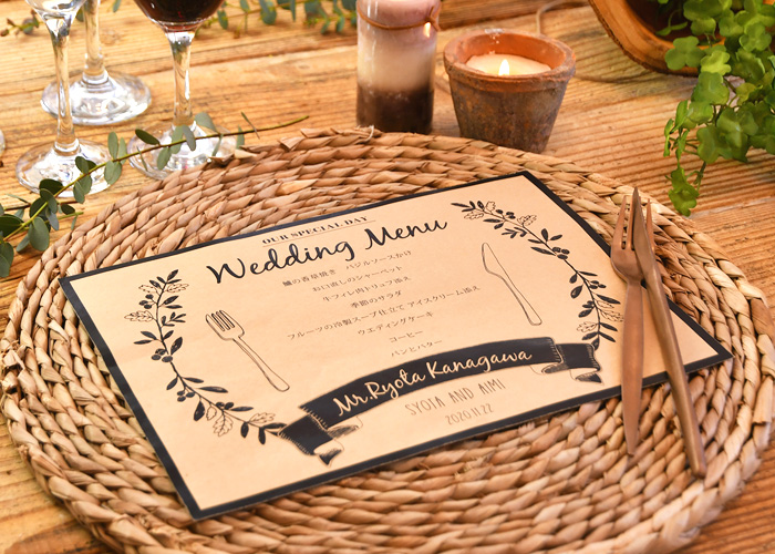 こちらはゲストテーブルのコーデに活躍してくれそうなランチョンマットみたいな席札。しかも、メニュー表まで兼ねているうれしいアイテムです。クラフト×ブラックの色使いがグリーンに映えてナチュラルヴィンテージ感を引き立ててくれます。